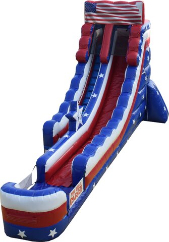 Climb to the top beneath waving stars and stripes, then take a thrilling ride down the slick slide into a refreshing splash pool below. Perfect for Fourth of July parties, Memorial Day, Labor Day, or any summer event where you want to make a bold statement of American pride!Built with commercial-grade materials and safety features like no-jump netting, sturdy steps, and splash landing area — this inflatable combines durability, fun, and national pride. Recommended Setup: Grass or pavement with access to water and power